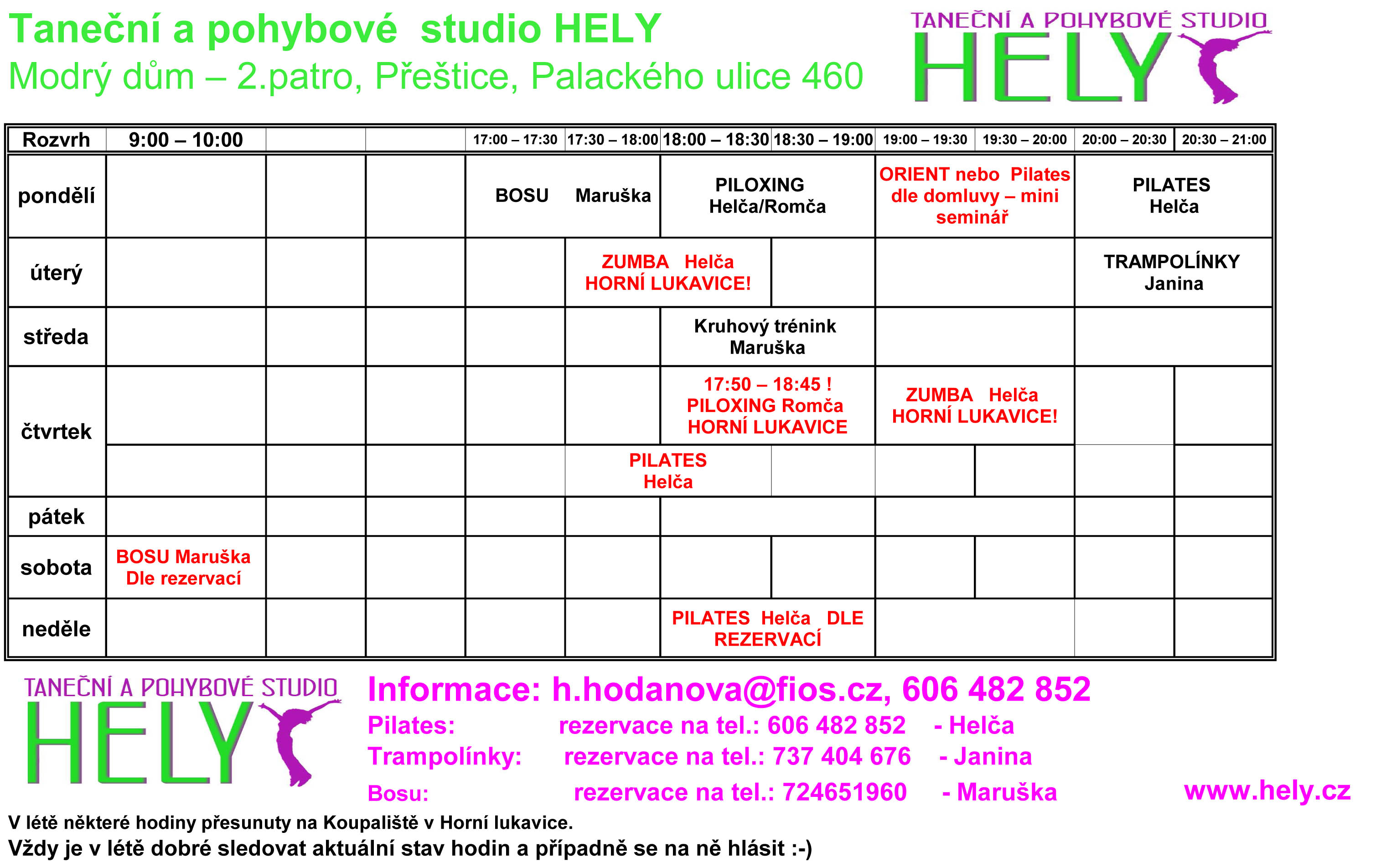 Letní rozvrh!! Helča 1.7.2014 Pozor, změna na léto v rozvrhu. Cvičíme v Přešticích na sále a v Horní Lukavici na koupališti. Hodiny v H.L. – je napsáno v rozvrhu, ostatní v Přešticích. 🙂