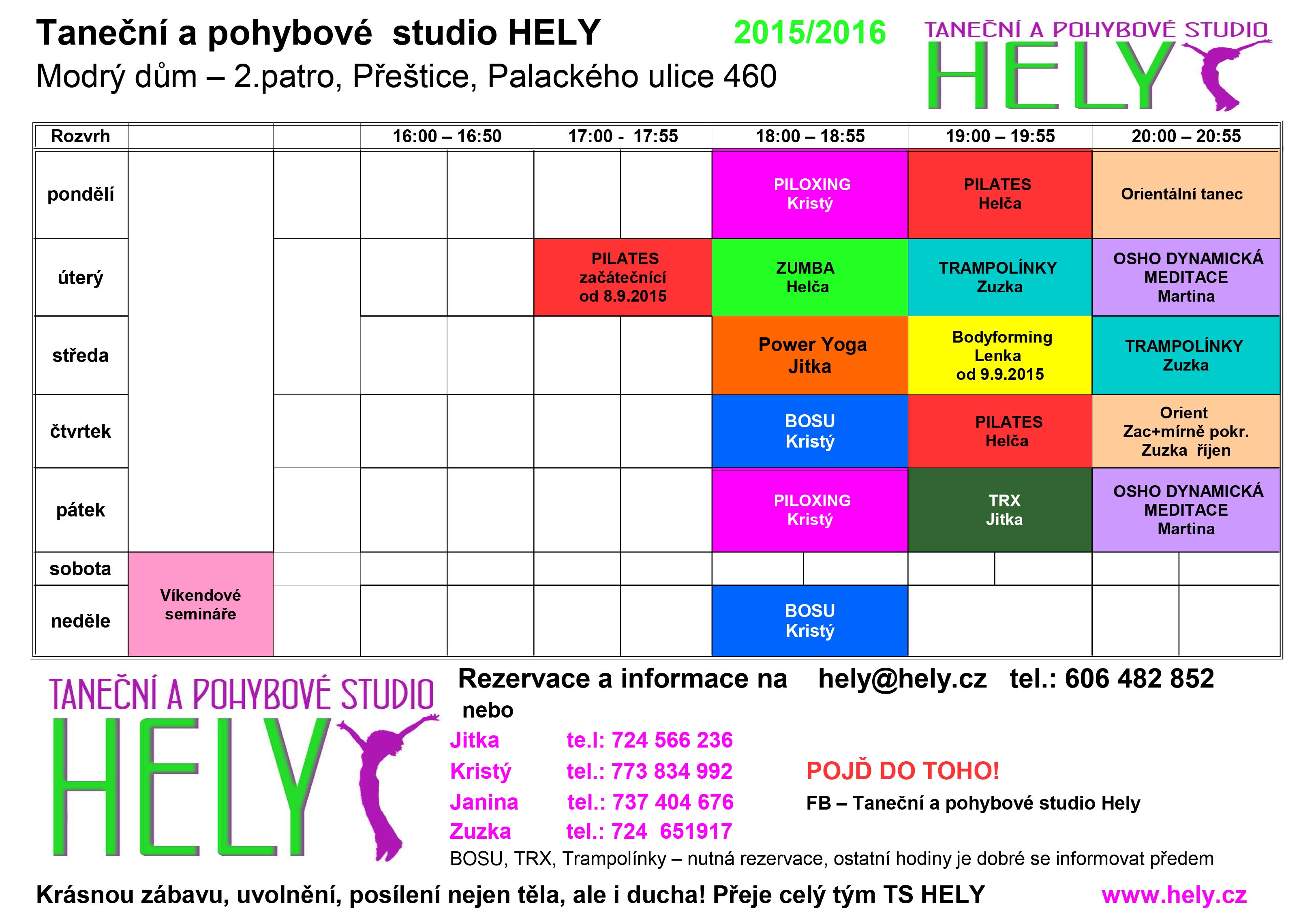 Přeštice cvičí Helča 26.8.2015 Rozvrh od příštího týdne – první týden v září (pokud není napsáno jinak) . Dětičky budeme vědět v příštím týdnu a přidáme. Prosím vydržte 🙂 Na všechny se moc těšíme! Tým Rozvrh cvičení v Přešticích